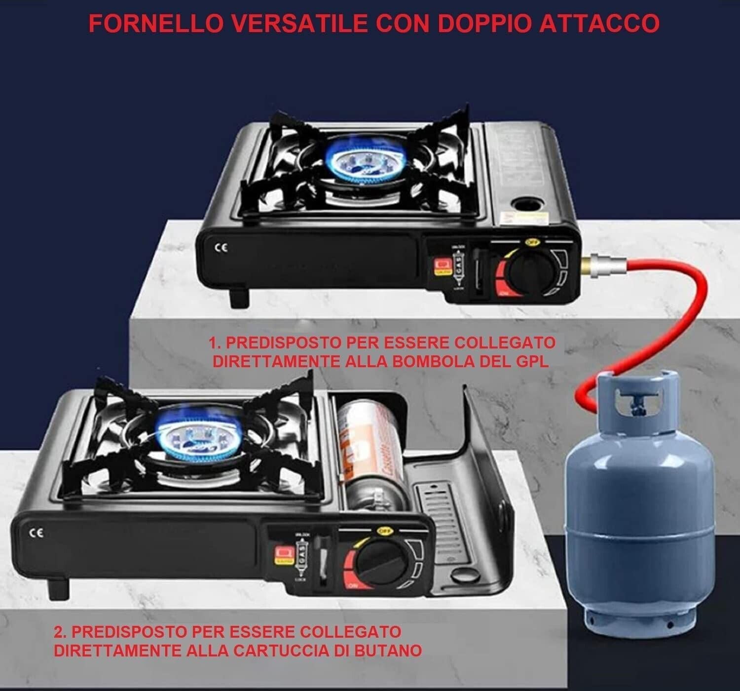 Fornello a Gas da Campeggio a Doppio attacco Cartucce di gas Butano o Bombola di gas GPL con Valigetta